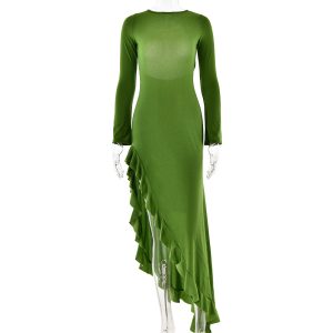 Summer new solid color round neck long sleeves backless high slit dress Fabric name: Knitted bright silk Pattern: solid color Technique: Collage/Splicing Main fabric composition: polyester (polyester fiber)