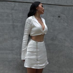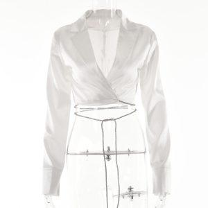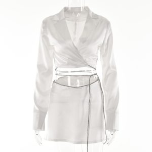 Autumn and winter hot style hot girl slim-fitting rose satin high-waisted lace-up short skirt long-sleeved cardigan two-piece set for women Popular element: exposed navel Technique: Collage/Splicing Fabric name: rose satin Main fabric composition: polyester (polyester fiber)